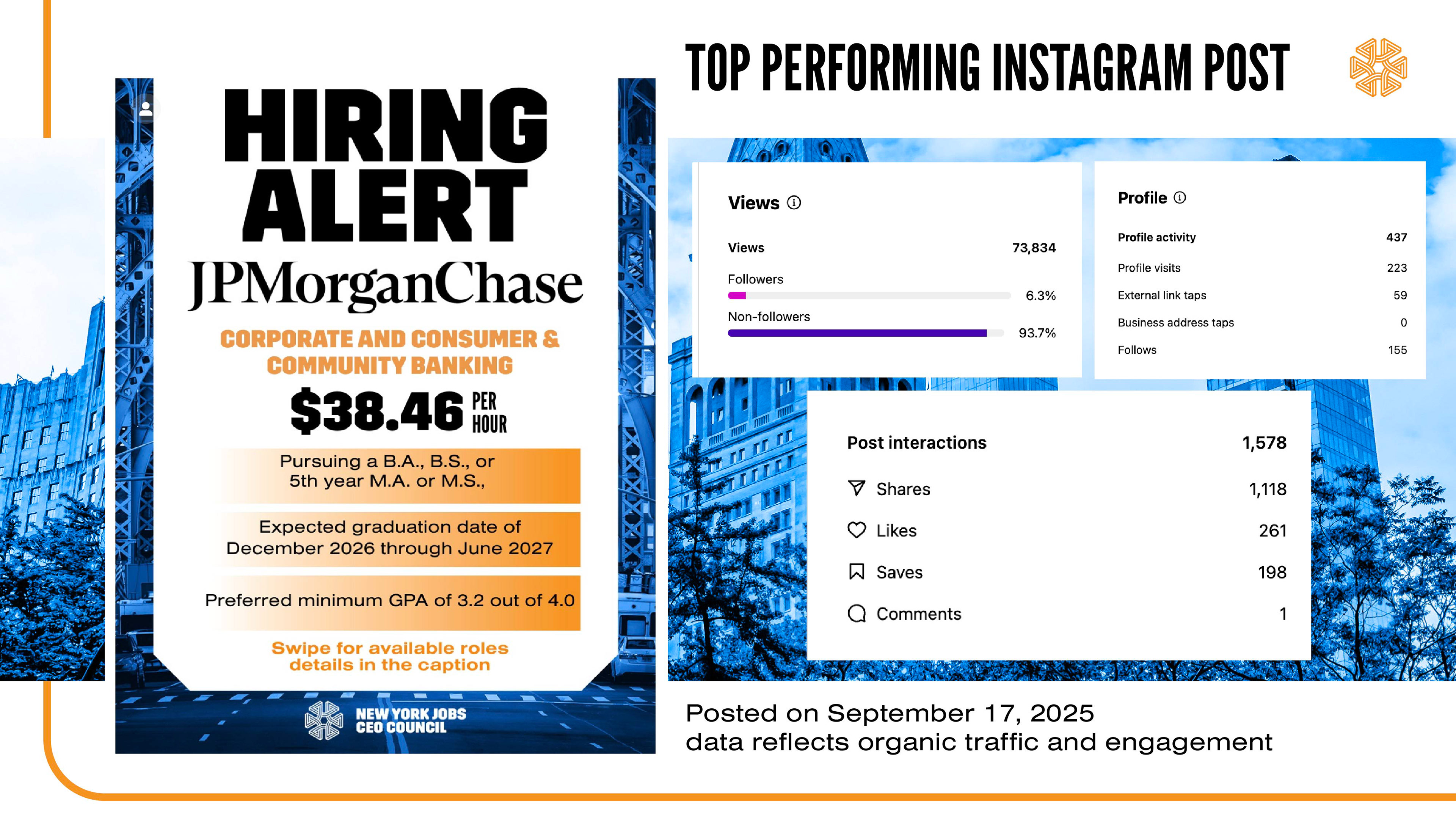 The Jobs Council posts hiring alerts for its member companies weekly. This version was designed by an external agency. The team internally complained that the asset took too long to generate. I designed a version below which boosted engagement and reduced the time necessary to generate the asset.